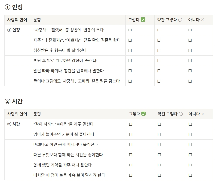 - 각 영역당 ‘그렇다’가 많은 영역이 아이의 주 사랑의 언어